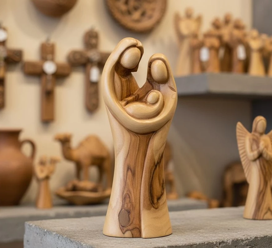 Ogni statua della Sacra Famiglia in legno d’olivo è intagliata da abili artigiani cristiani di Betlemme le cui famiglie praticano quest’arte sacra fin dal IV secolo. Il loro lavoro paziente trasforma un unico pezzo di legno in un’espressione di amore, unità e grazia divina. Le curve delicate, le superfici levigate e lo stile minimalista senza volto esaltano la purezza delle forme e delle emozioni, creando una scultura che irradia pace e fede.